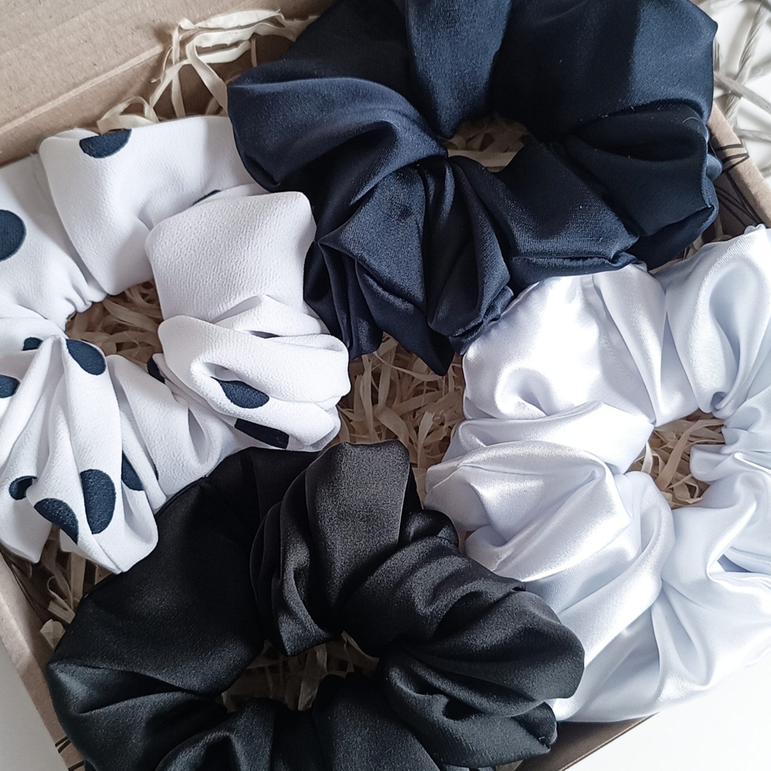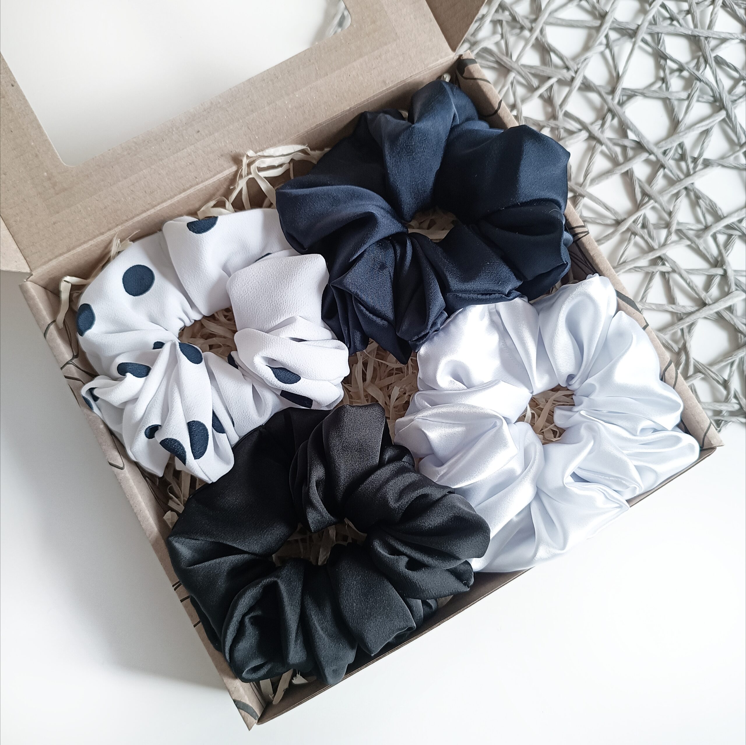 Box prezentowy ze scrunchies – elegancki zestaw 4 ręcznie szytych gumek do włosów