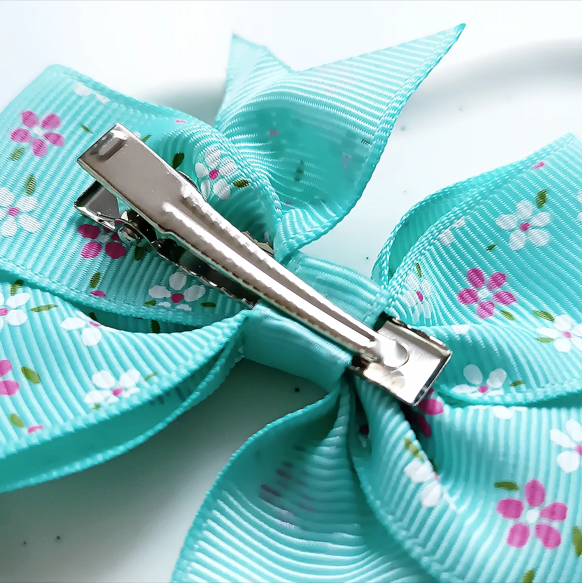 Metalowa spinka typu krokodylek zapewnia szybkie i wygodne zapinanie. Wystarczy jeden ruch, aby kokarda znalazła się na swoim miejscu i stabilnie trzymała fryzurę.