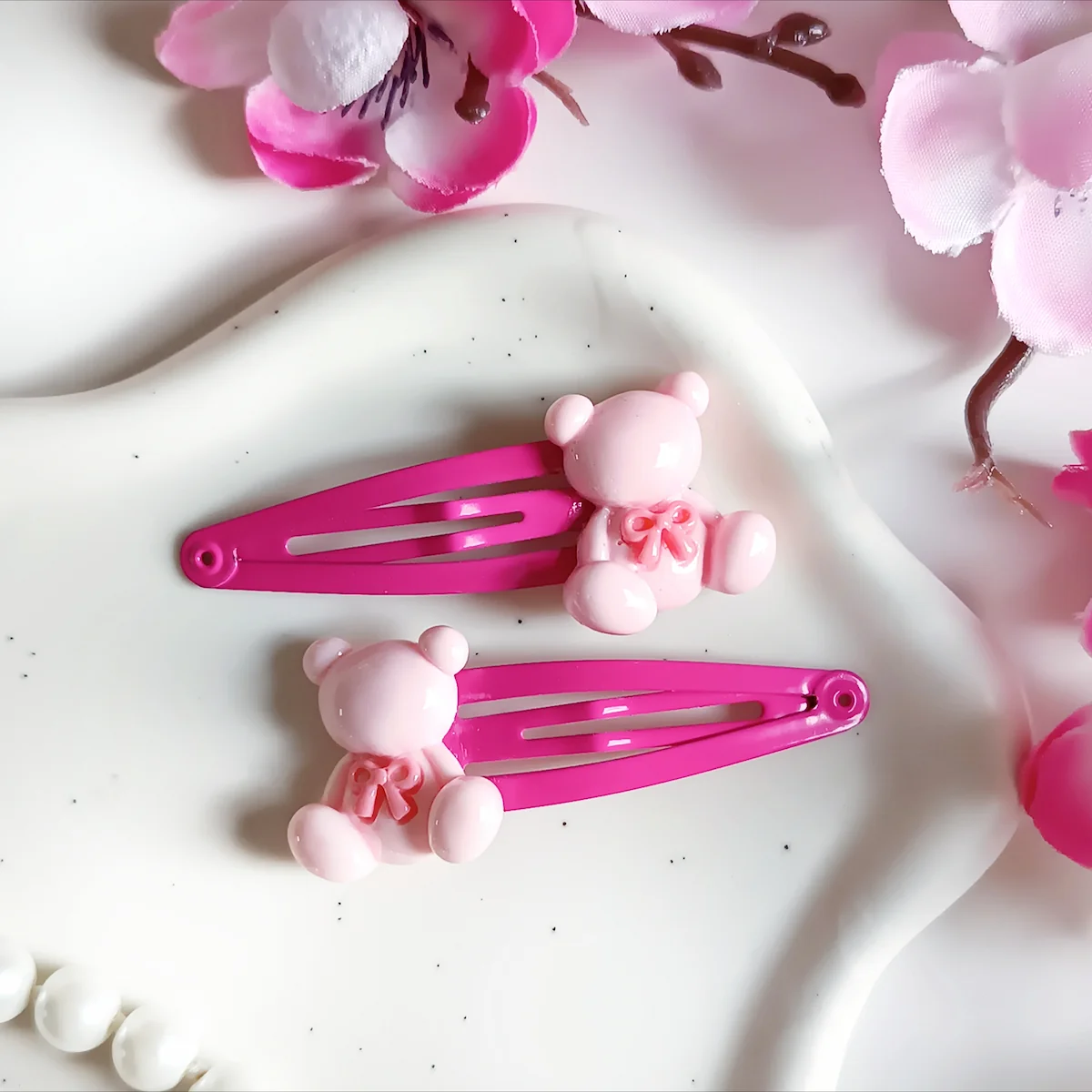 Spinki umieszczone są na lekkiej i wygodnej bazie typu klik-klak, dzięki czemu łatwo się je zakłada i zdejmuje. Jednocześnie dobrze trzymają włosy, pomagając utrzymać fryzurę przez cały dzień – bez ciągnięcia i bez dyskomfortu.