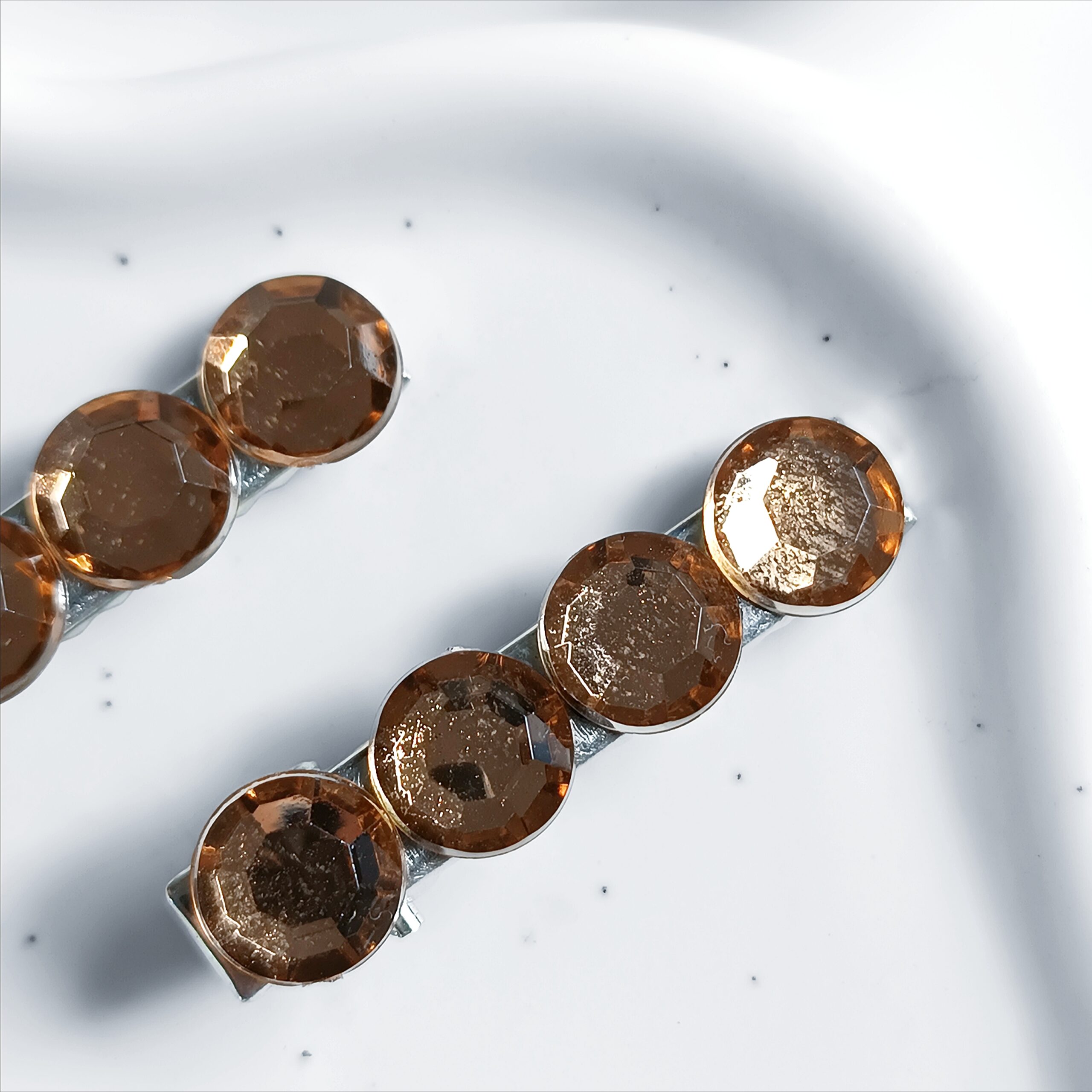 Baza typu krokodylek to gwarancja komfortu i stabilności. Spinki łatwo się zapinają i zdejmują, a jednocześnie trzymają włosy pewnie przez cały dzień. Pasują do różnych rodzajów włosów – cienkich, grubych, prostych, a także kręconych. Nie zsuwają się, a ich delikatne krawędzie nie szarpią pasm. Cyrkonie zostały ręcznie przyklejone mocnym klejem jubilerskim, dzięki czemu są odporne na odpadanie, a także zachowują swój blask przez długi czas.